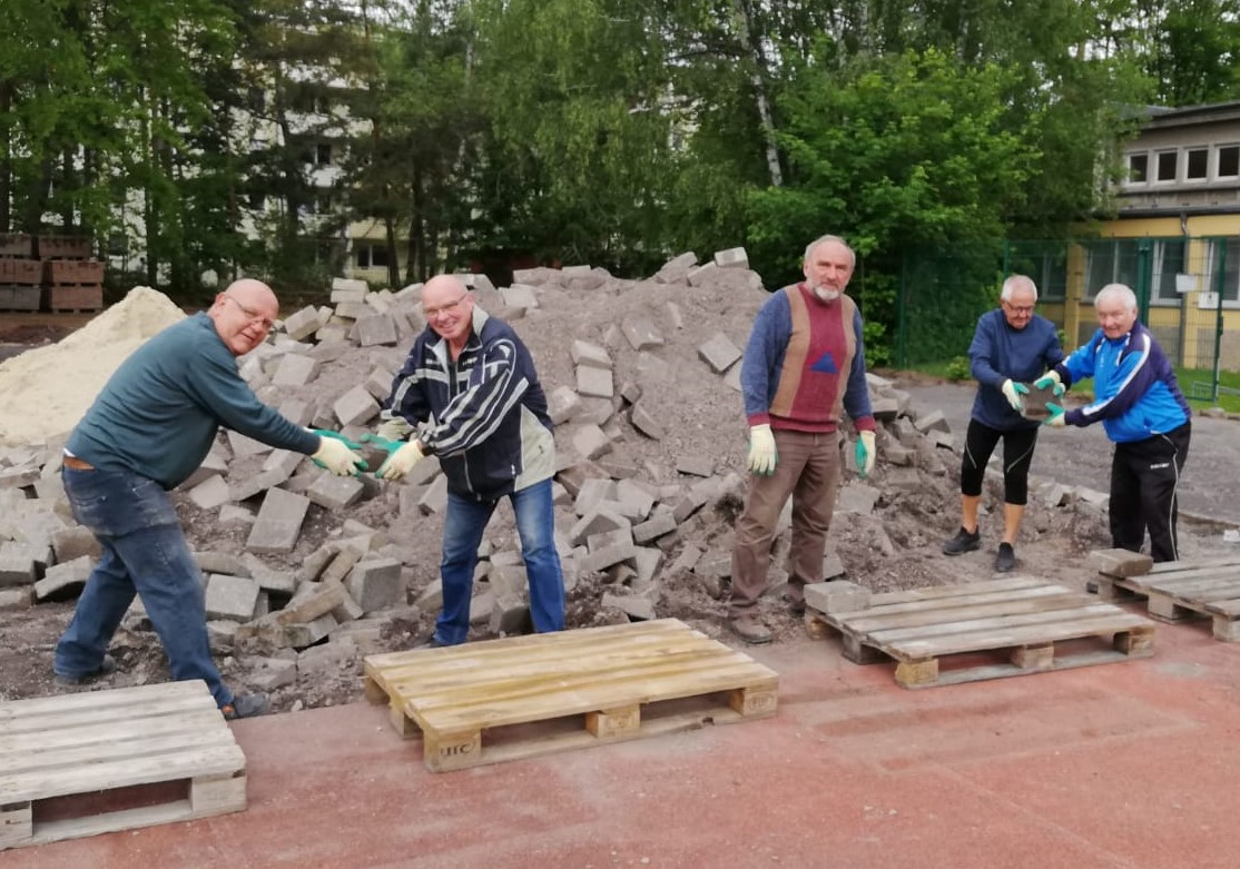 Mitglieder des Seniorenbeirates der Stadt Hermsdorf und des Ältestenrates des SV Hermsdorf machen sich nützlich. Fünf Mitglieder beider Gremien helfen bei der Kosteneinsparung und der nachhaltigen Verwendung von Baumaterial beim Projekt „Hartplatz“. Der alte Hartplatz wird komplett erneuert. Es soll eine neue Sportanlage entstehen, die sowohl für die Durchführung des Schulsportes als auch zum Sporttreiben der Aktiven des SV Hermsdorf genutzt werden kann. Aber auch für die Durchführung von zentralen kreis- und landessübergreifenden Sportereignissen wird die Stadt Hermsdorf damit ihrem guten Ruf als „Sportstadt“ immer besser gerecht.